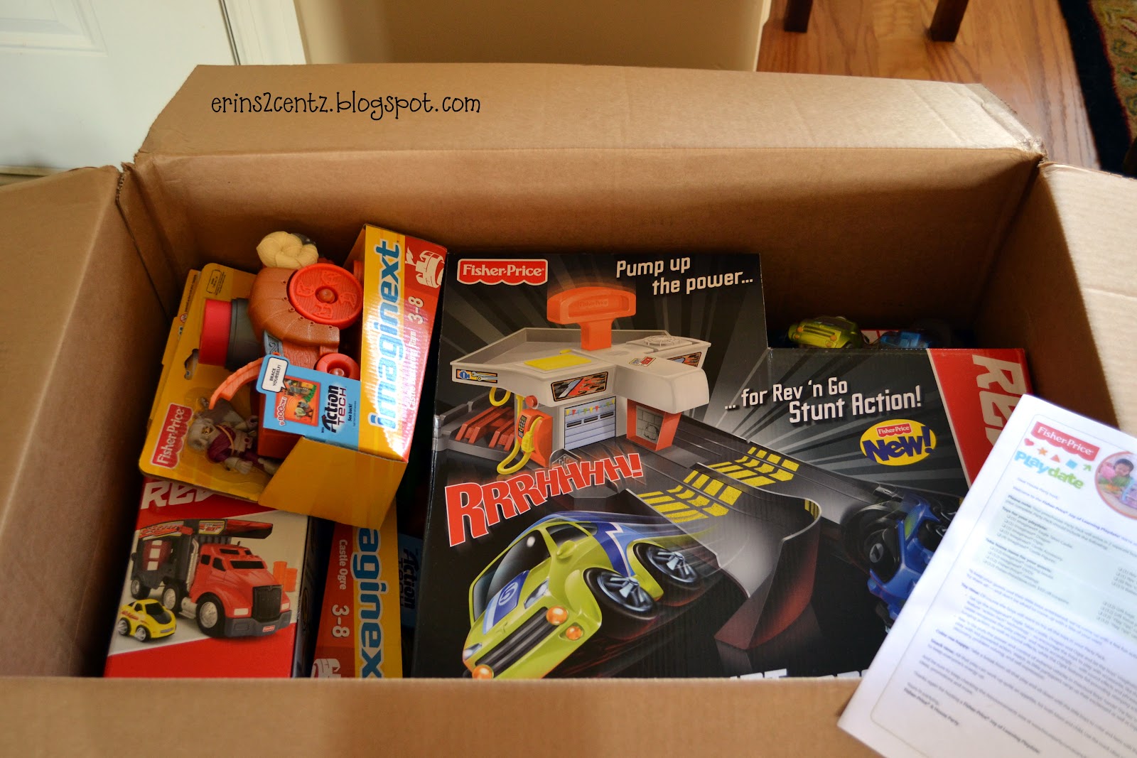We received the {Rev 'n Go Stunt Garage} and the {Imaginext Eagle Talon Castle} sets.